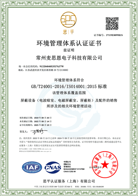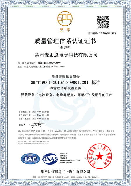常州麦思恩电子科技有限公司 注册成立于2012年,2022年认证为高新技术企业,是由国内最早一批从事EMC技术开发、电磁屏蔽室、电波暗室、电磁混响室、医疗屏蔽室、电磁屏蔽材料等研究的技术骨干组成的新兴科技公司,技术人员占公司员工总数的40%以上,生产安装人员均具有多年的从业经验;公司成立以来,相继开发了拼装、焊接、移动、便携式等多种规格型号的电磁屏蔽室、天线测量暗室、EMC电波暗室、屏蔽柜(箱),产品覆盖信息安全、计量检测、电力试验、电子通信等领域,客户遍布航空航天、邮电通信、党政机关、政府质量监督检验部门、电子产业生产企业巨头等多个行业,在电磁兼容行业内已取得显著的成果。